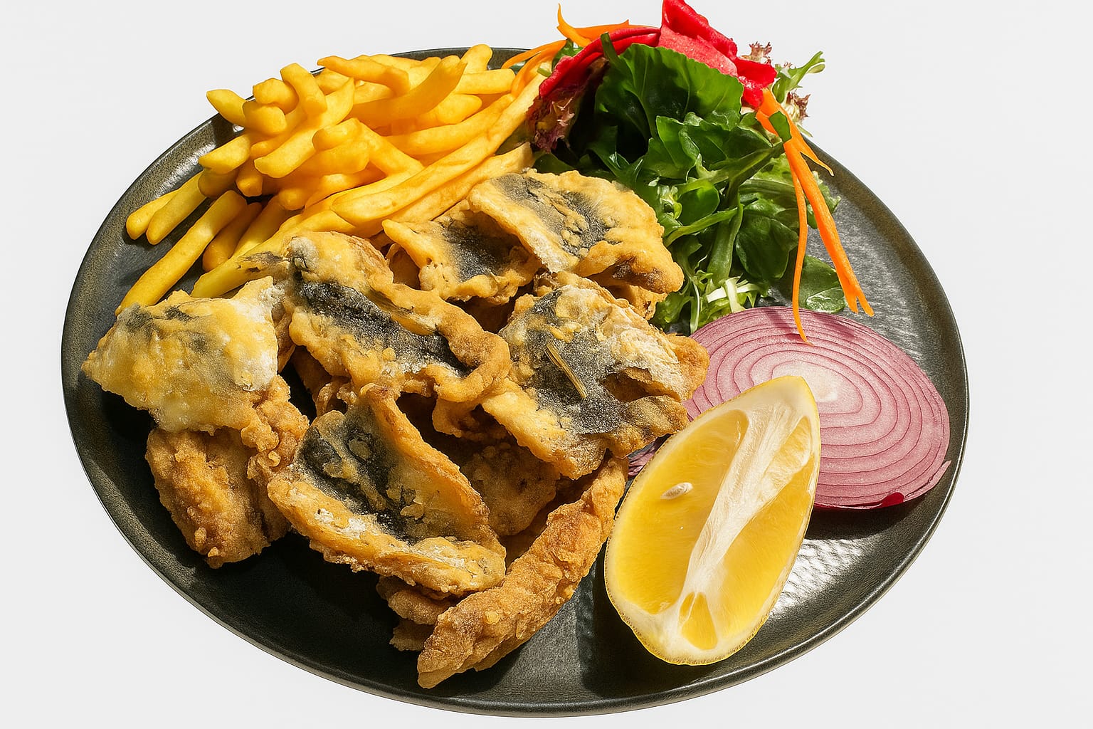 Derin yağda kızartılmış kılçıksız hamsi fileto,Yeşil salata,Patates cipsi, Kırmızı soğan ve limon ile servis edilir.