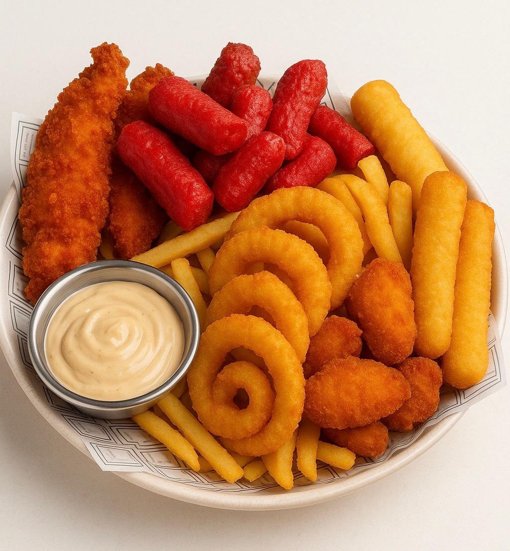 ( patates kızartması, tavuk pane, dana sosis ızgara,soğan halkası,sigara böreği, çıtır zeytin, mozzarella stick)